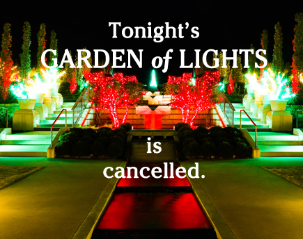 Due to safety concerns because of weather and travel conditions, we have canceled Garden of Lights for Sunday, Dec. 13.  Ticketholders have been emailed with instructions and more information.